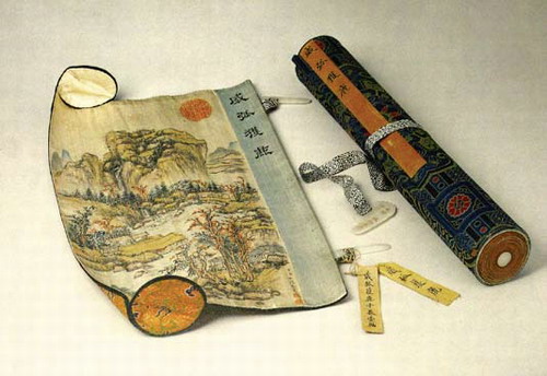 清代织锦《威弧获鹿图》卷轴画套,长3 6厘米,直径6 . 5厘米,故宫博物院藏。画套是中国卷轴的典型包装形式,此画套为杏黄色的金线织锦,压黑色包边,画套上的白玉别子仿汉玉蝉形。