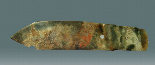 故宫珍藏的商代玉戈,由于年代久远,作为包装物的丝麻织物已紧紧地黏附在玉戈表面